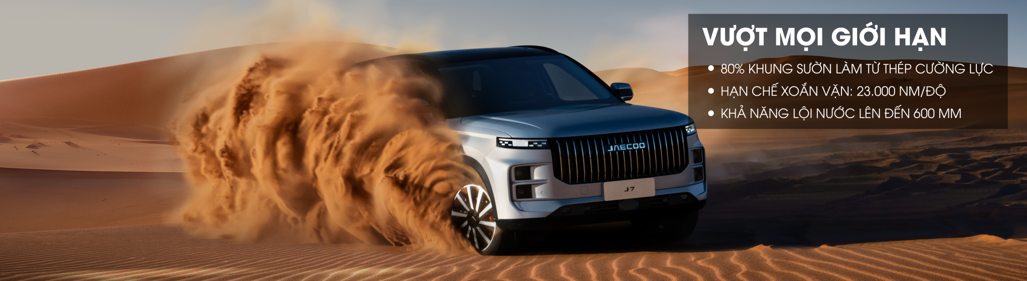 JAECOO J7 được thiết kế để chinh phục mọi thử thách địa hình nhờ 80% khung sườn được làm từ thép cường lực, đảm bảo độ bền vượt trội và an toàn tối đa. Khả năng chống xoắn vặn lên đến 23.000 Nm/độ giúp xe ổn định ngay cả khi di chuyển trên cung đường gập ghềnh. Không chỉ vậy, JAECOO J7 còn có khả năng lội nước ấn tượng đến 600 mm, sẵn sàng đồng hành trong mọi điều kiện thời tiết và địa hình khắc nghiệt.
